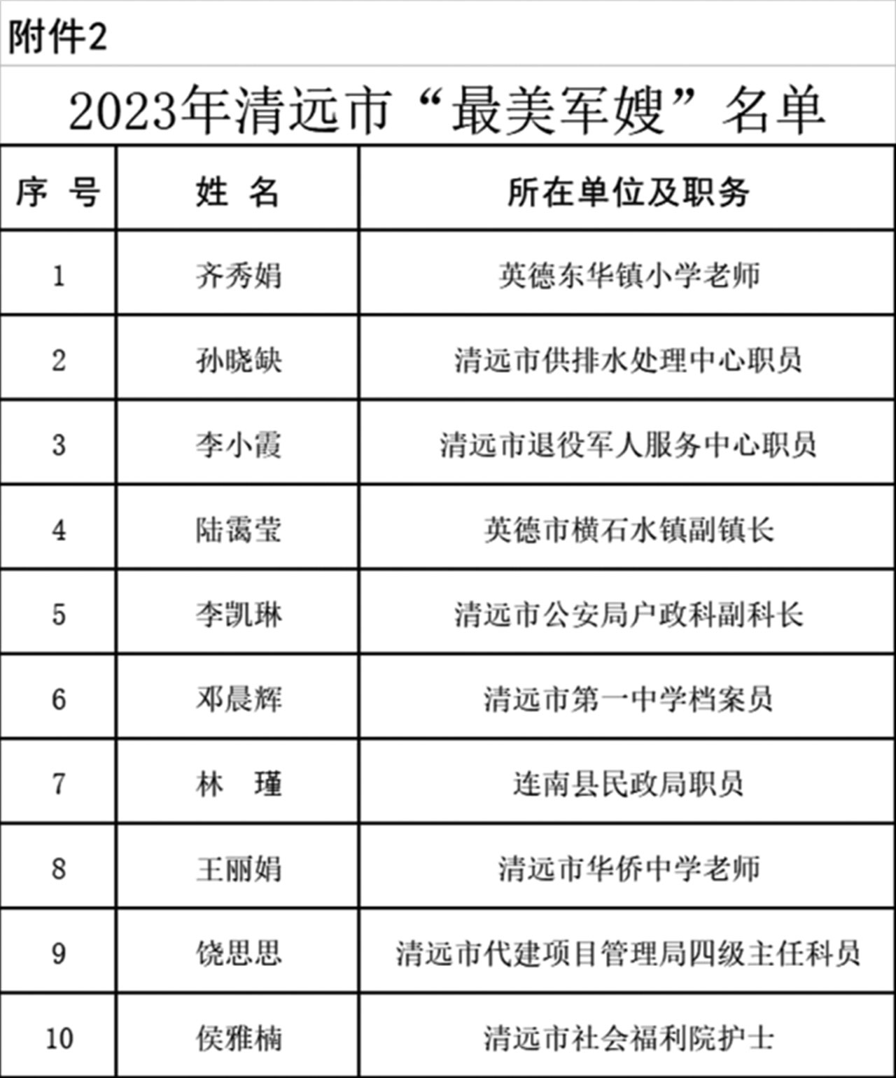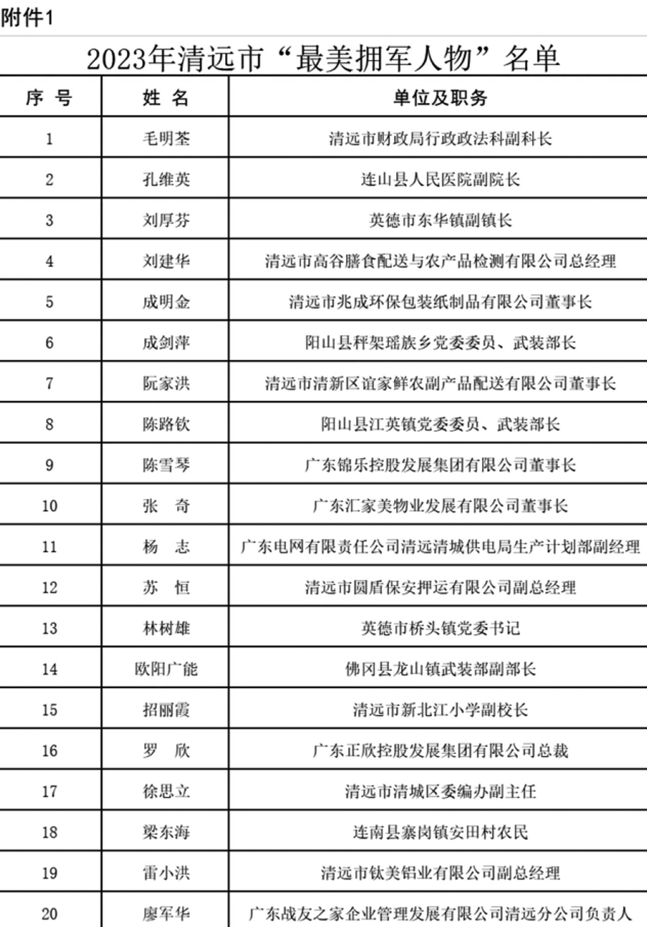 為激勵廣大干部群眾學(xué)習(xí)最美、爭當(dāng)最美,在全社會大力營造關(guān)心國防、尊崇軍人濃厚氛圍,營造立足崗位作貢獻、建功立業(yè)新時代的時代風(fēng)尚,清遠(yuǎn)市雙擁工作領(lǐng)導(dǎo)小組對毛明荃等20名“最美擁軍人物”、齊秀娟等10名“最美軍嫂”予以通報表揚。