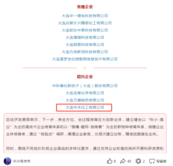 大連中沐化工有限公司被認定為遼寧省瞪羚企業