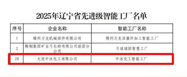 近日,省工信廳網站發布“2025年遼寧省數字化車間、先進級智能工廠”擬定名單公示,大連中沐化工有限公司中沐化工智能工廠位列其中,擬獲得省先進級智能工廠認定